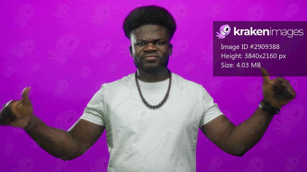 Man with white t shirt and beaded necklace points both thumbs to chest while facing camera in a purple studio; confidence.