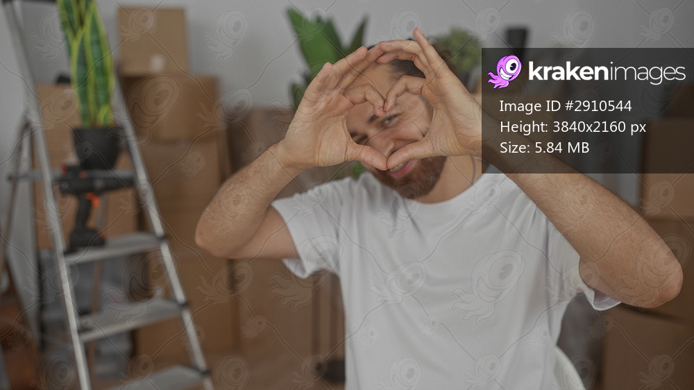 Man with white t shirt and beard forms heart with hands in building surrounded by moving boxes and ladder; love moving.