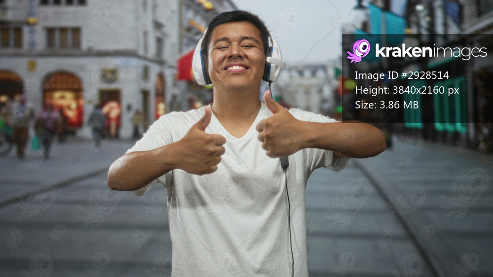 Man with white t shirt and headphones giving thumbs up on busy street, smiling with eyes closed; joy confidence.