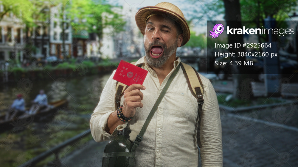 Man winking and sticking out tongue while holding passport on a street by an amsterdam canal; playful travel.