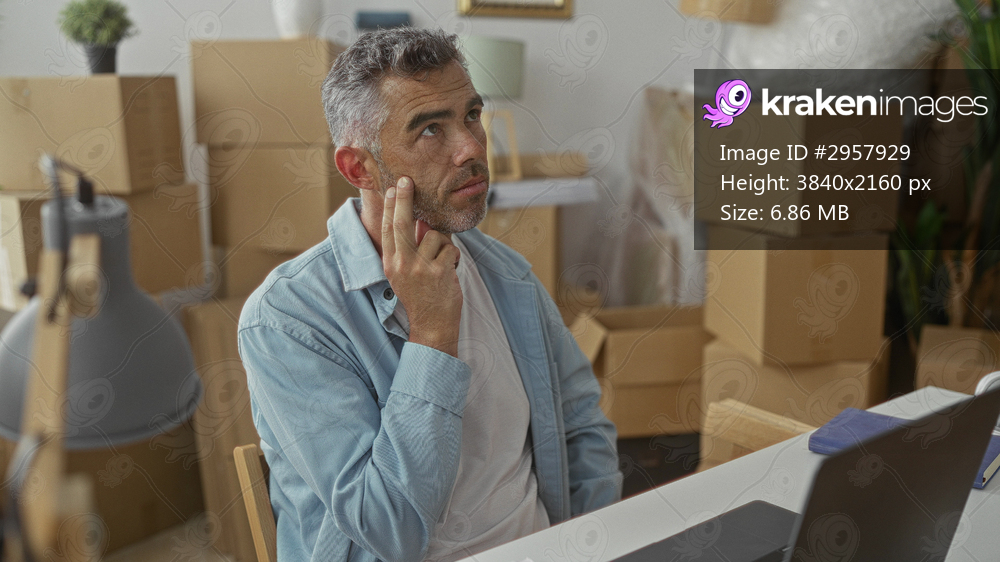 Man working at laptop with hand on touchpad amid packed moving boxes, stacked cardboard and scattered papers on desk in building; relocation stress.