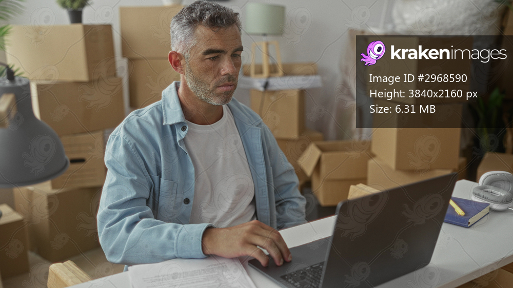 Man working at laptop with hand on touchpad amid packed moving boxes, stacked cardboard and scattered papers on desk in building; relocation stress.