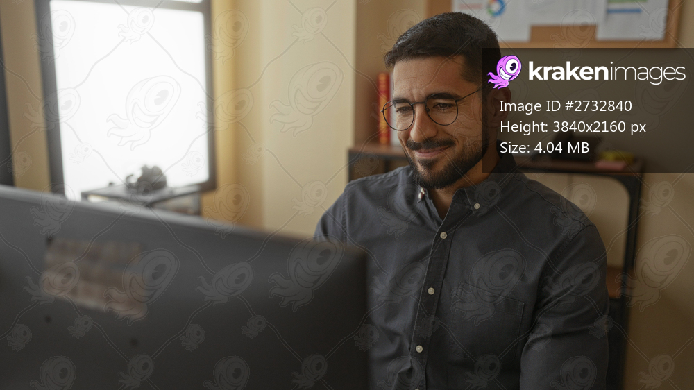 Man working in modern office setting, looking focused and engaged on computer screen with charts on the wall and plants visible, reflecting professional work environment. - Kraken Images