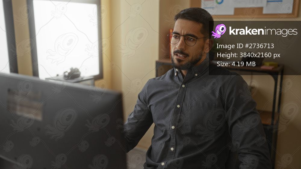 Man working in modern office setting, looking focused and engaged on computer screen with charts on the wall and plants visible, reflecting professional work environment. - Kraken Images