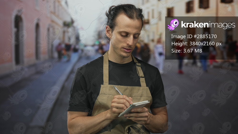 Man writes in notebook with pen on a busy street, hands visible and holding notepad; quiet contemplation note taking.