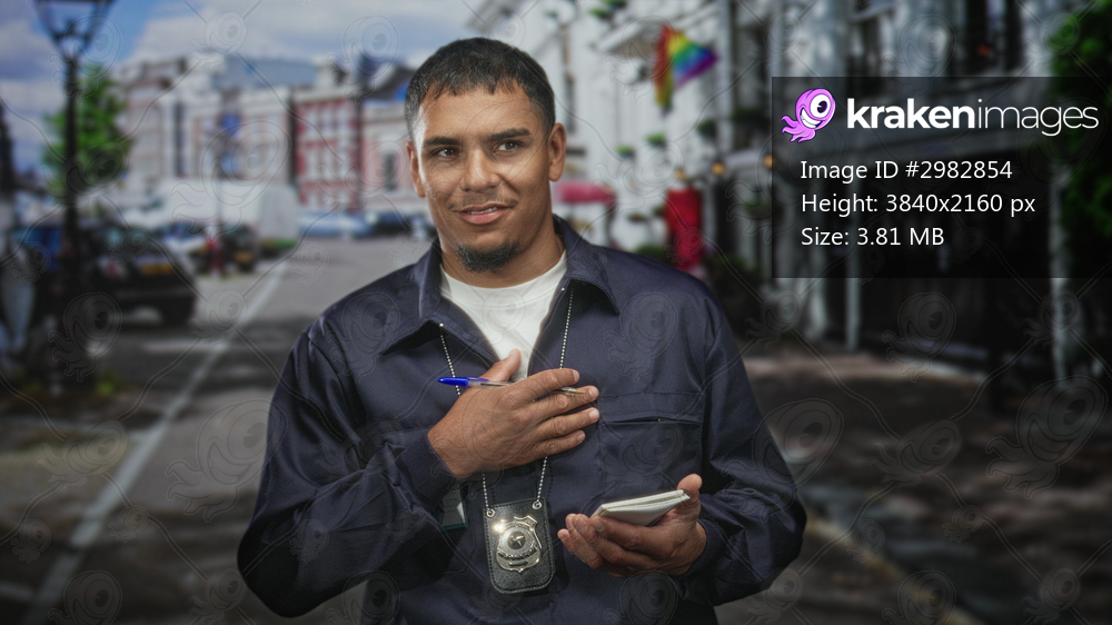Man writing in notepad with pen and visible police badge, hand holding pad on street; investigation duty focused.