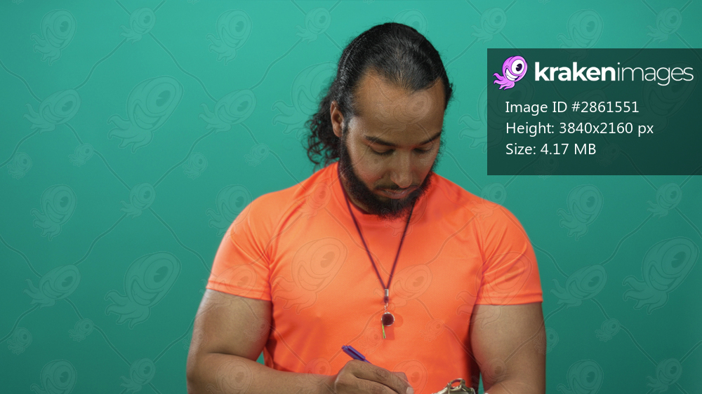 Man writing on a clipboard with visible forearms and whistle in studio with teal backdrop; concentration.