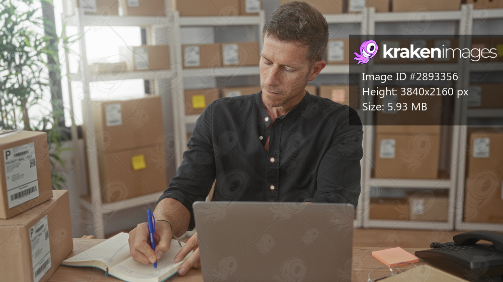 Man writing with pen in notebook by laptop and parcel boxes in building storage room; small business focus.