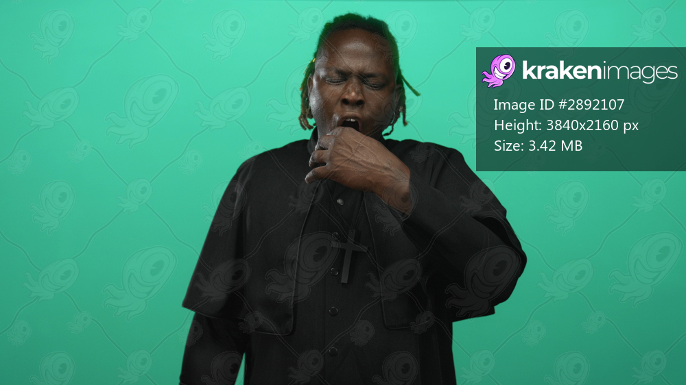 Man yawning with hand in mouth, wearing cross necklace and black robe against green backdrop in studio; tiredness reflection.
