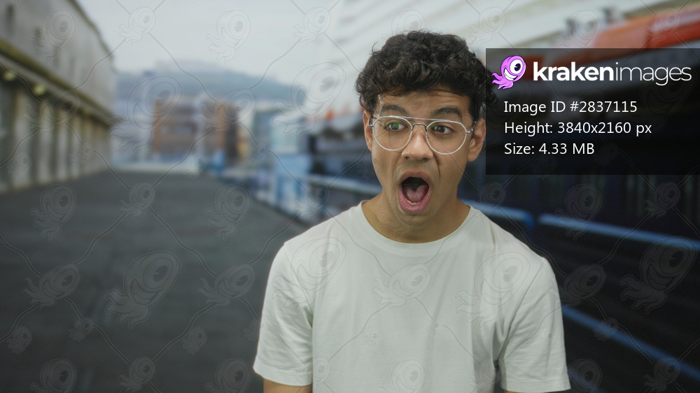 Man yawns beside boat in front of building facade wearing glasses with mouth wide open; tiredness fatigue.