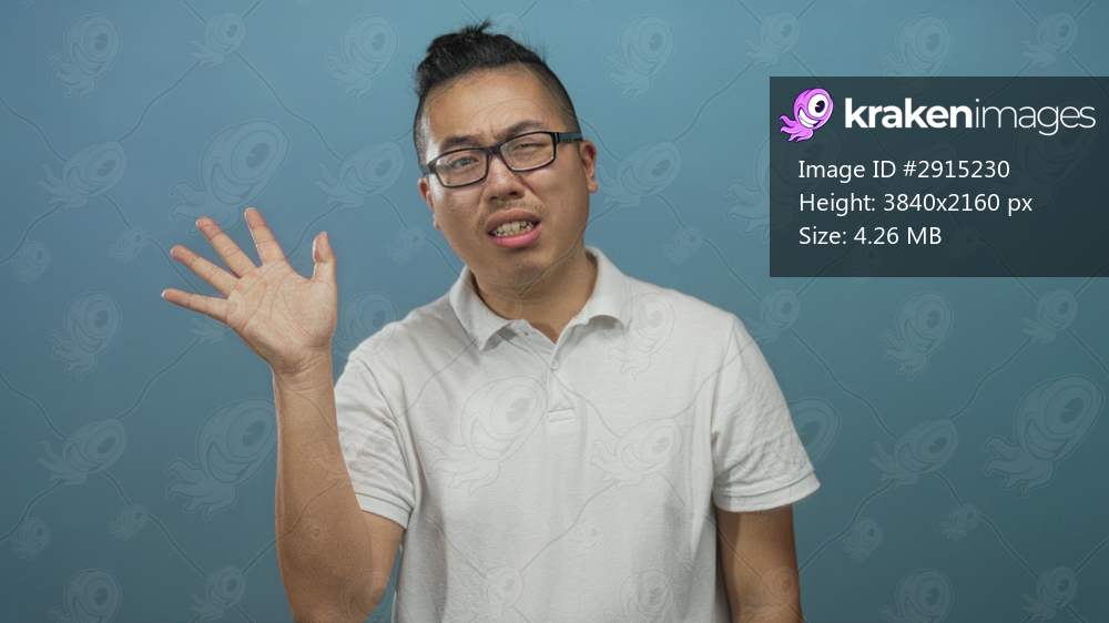 Man, young adult chinese, waving hand with open palm and squinting face in blue studio; friendly greeting.