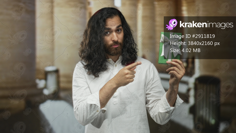 Man young arab hispanic with beard and long hair holds green gift box with white bow and points finger to it on old town street; skepticism.