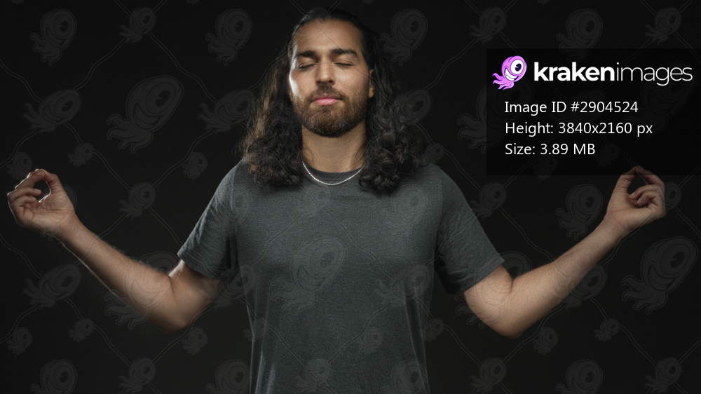 Man, young arab hispanic with long hair and beard, hands in meditation mudra and closed eyes in studio on black backdrop; calm mindfulness.