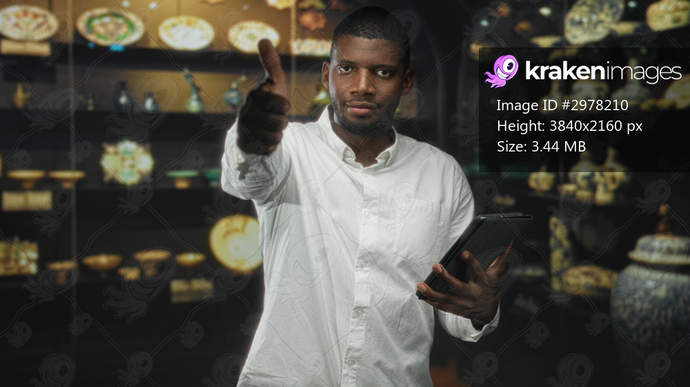 Man young black handsome in white shirt holding tablet showing thumbs up while surveying exhibits in museum building; approval trust guidance.