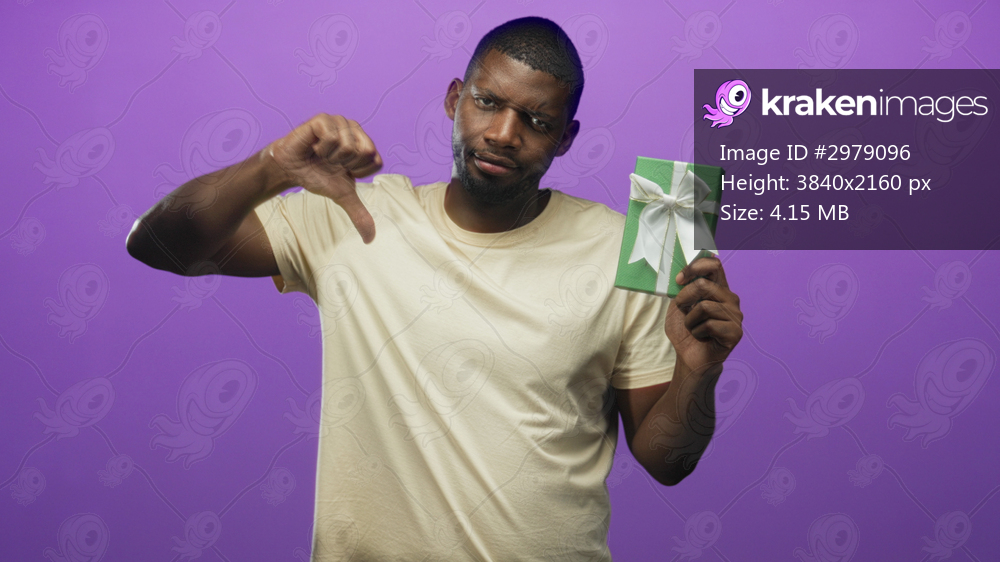 Man young black holding green gift box and giving thumbs down gesture in studio with purple backdrop and neutral shirt; disappointment rejection.