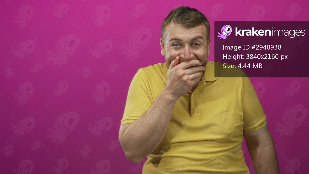 Man young caucasian with hand covering mouth wearing yellow polo in pink studio; stifled awkward amusement.