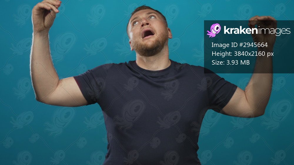 Man young caucasian heavyset raising both arms with open hands in studio against teal wall; surprise curiosity.