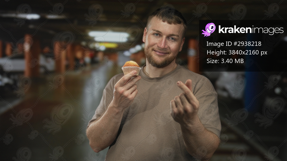 Man, young caucasian and overweight, holding a cupcake and making finger heart gesture inside a parking building with cars in view; playful snack moment. - Kraken Images
