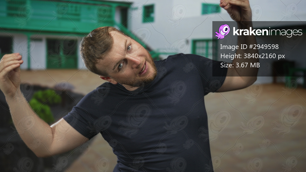 Man young caucasian raising both arms with open hands and tilted head in front of a building courtyard; surprise spontaneity curiosity.