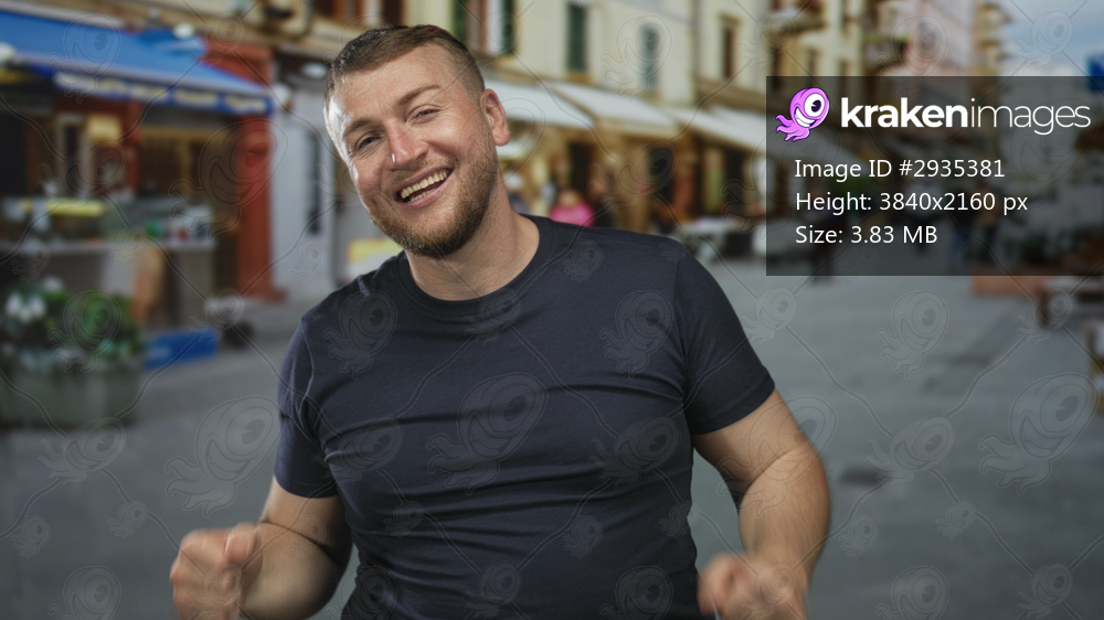 Man young caucasian smiling with fists raised, bare forearms visible in a busy street market wearing a dark t shirt; joy celebration.