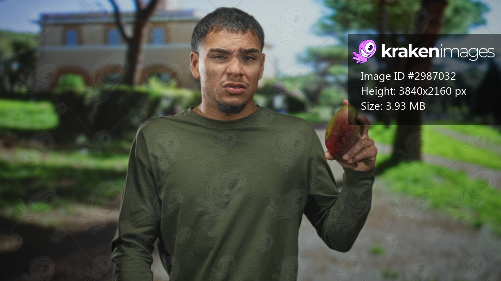 Man young handsome holding mango in his right hand, grimacing and squinting while standing near a building and trees; skepticism.