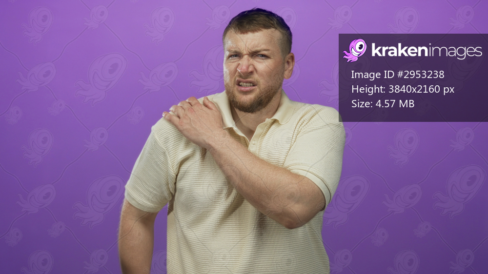 Man young heavyset clutching left shoulder grimacing in studio with vivid purple backdrop; pain recovery caution.