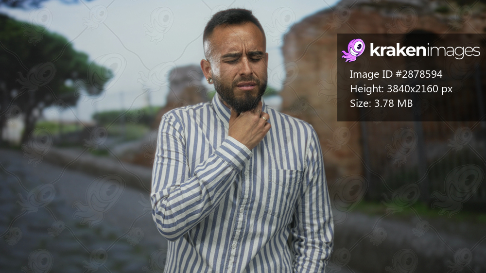 Man young hispanic clutching neck with hand for choking on cobbled street by ancient building and fence; panic medical emergency.