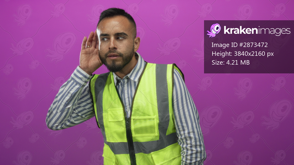 Man young hispanic engineer with hand to ear wearing high visibility vest in purple studio; alertness safety.