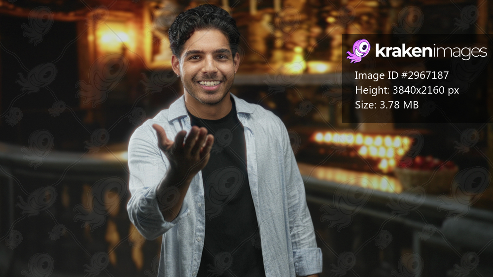 Man, young hispanic, extending hand forward and smiling in a building with votive candles and ornate altar, beckoning gesture and casual shirt visible; welcoming invitation warmth. - Kraken Images