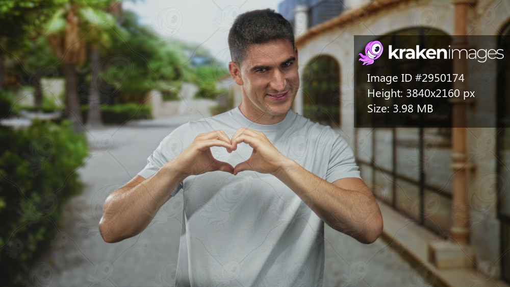 Man young hispanic forming heart with both hands at building facade outdoors on a tree lined street; affection connection.