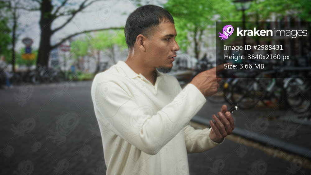 Man young hispanic handsome texting on smartphone with visible hands and focused expression on street lined with parked bicycles and trees near buildings; thoughtful focus. - Kraken Images