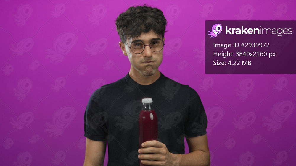 Man young hispanic holding a bottle with hand and cheeks puffed in purple studio wearing glasses and black shirt; playful curiosity.