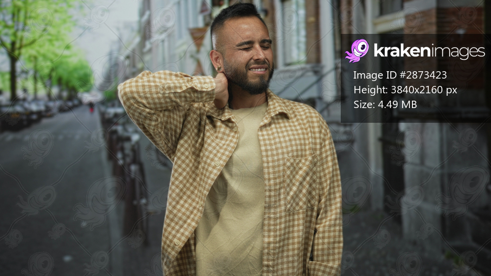 Man young hispanic in beige checked shirt holding neck with hand and wincing on a city street with parked bikes and brick buildings; pain.
