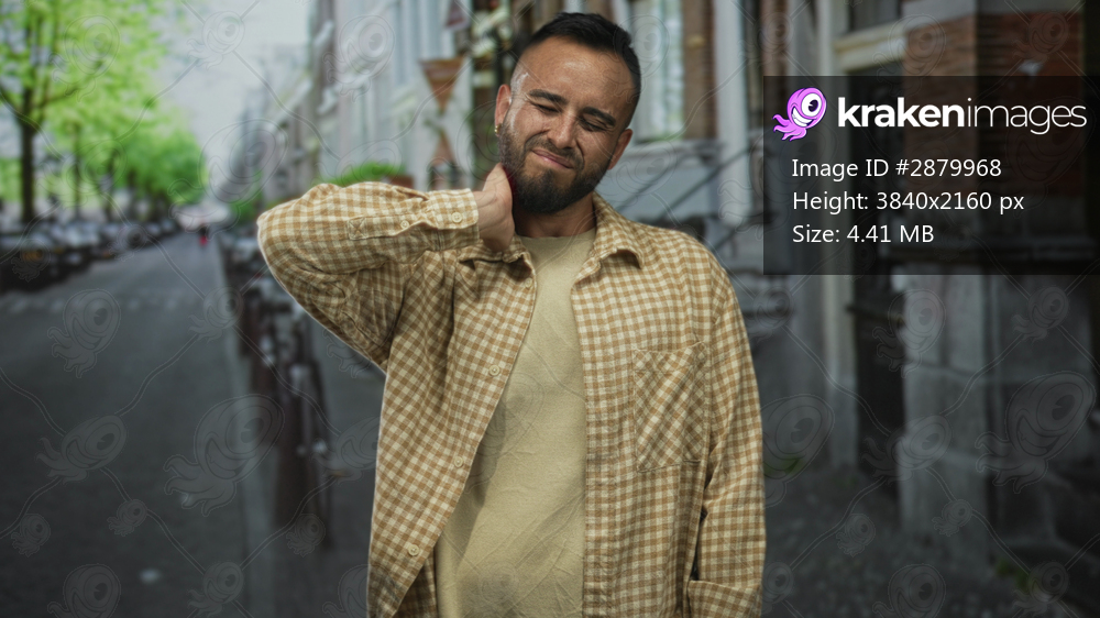 Man young hispanic in beige checked shirt holding neck with hand and wincing on a city street with parked bikes and brick buildings; pain.