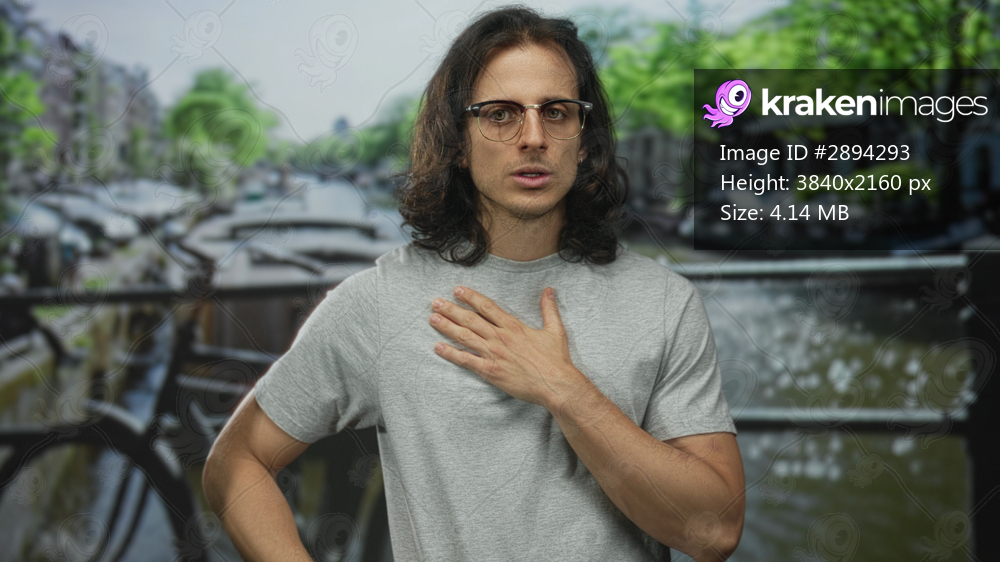 Man, young hispanic with long hair and hand to chest on street by amsterdam canal, wearing glasses and gray t shirt, looking pensive; sincerity introspection. - Kraken Images