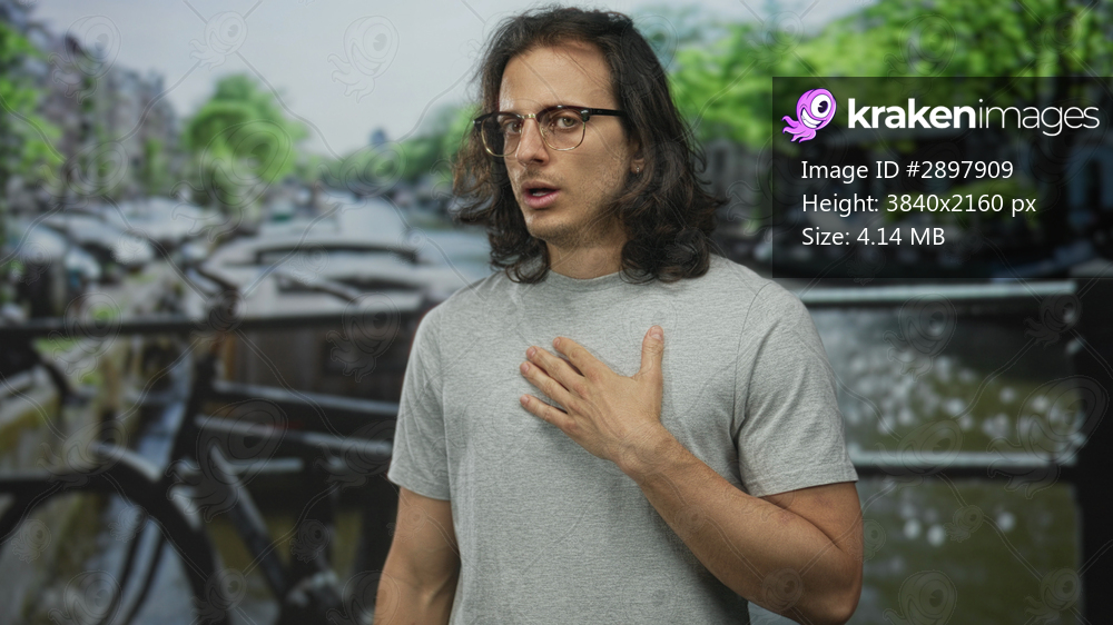 Man, young hispanic with long hair and hand to chest on street by amsterdam canal, wearing glasses and gray t shirt, looking pensive; sincerity introspection. - Kraken Images