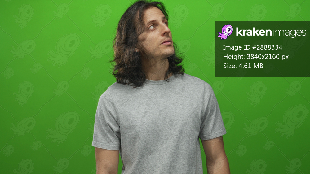 Man young hispanic with long hair looking up in a studio, gray t shirt and bare forearm visible; contemplation.