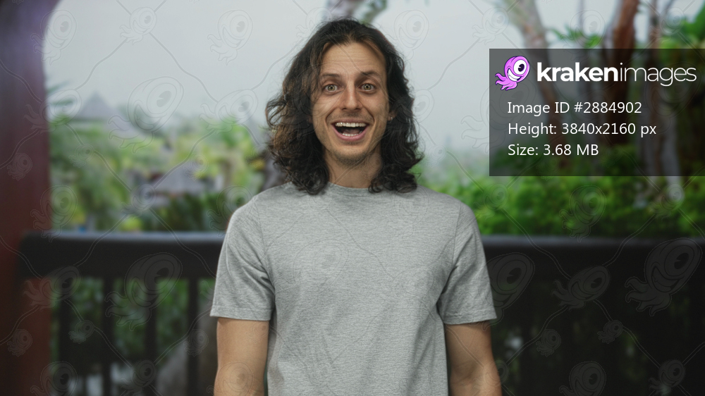Man, young hispanic with long hair, smiling with open mouth showing teeth on wooden railing in forest; happiness ease.