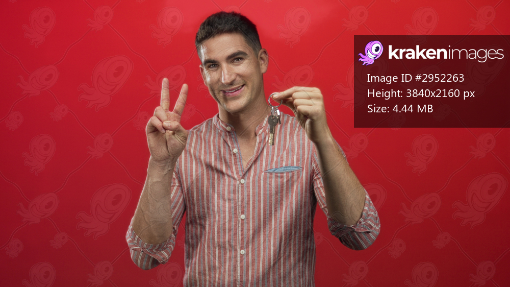 Man young hispanic smiling holding house keys and making peace sign in red studio wearing a striped shirt with visible hands; new home joy.