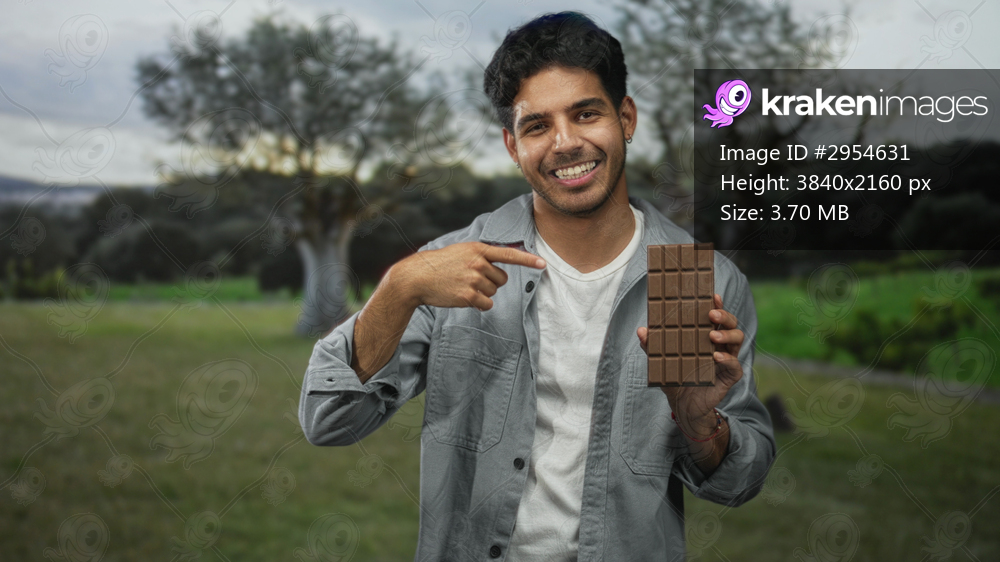 Man young hispanic smiling holds chocolate bar with right hand and points finger to chocolate in forest among trees and grass; happiness indulgence.