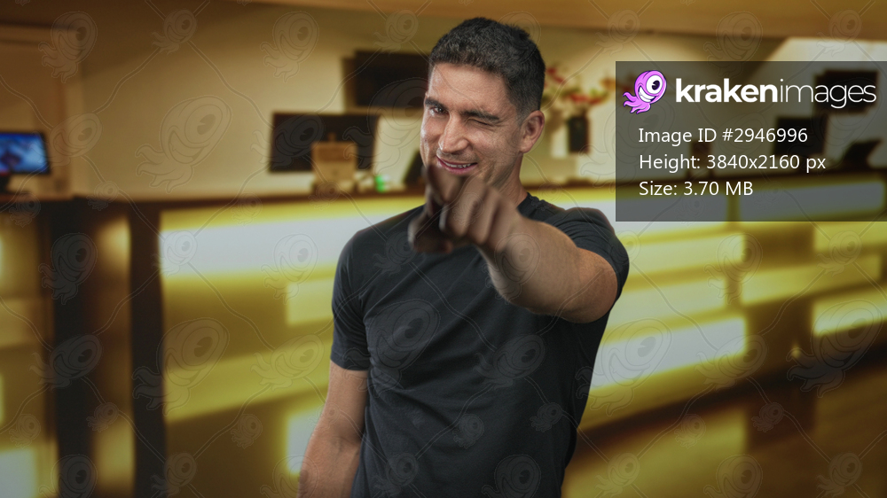 Man, young hispanic, smiling and points finger at camera showing bare forearm in hotel building; welcome.