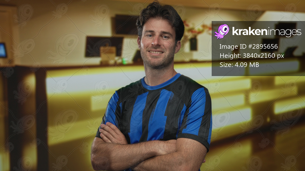Man, young hispanic soccer fan in a blue striped jersey with arms crossed showing forearms at a hotel reception building; confidence.