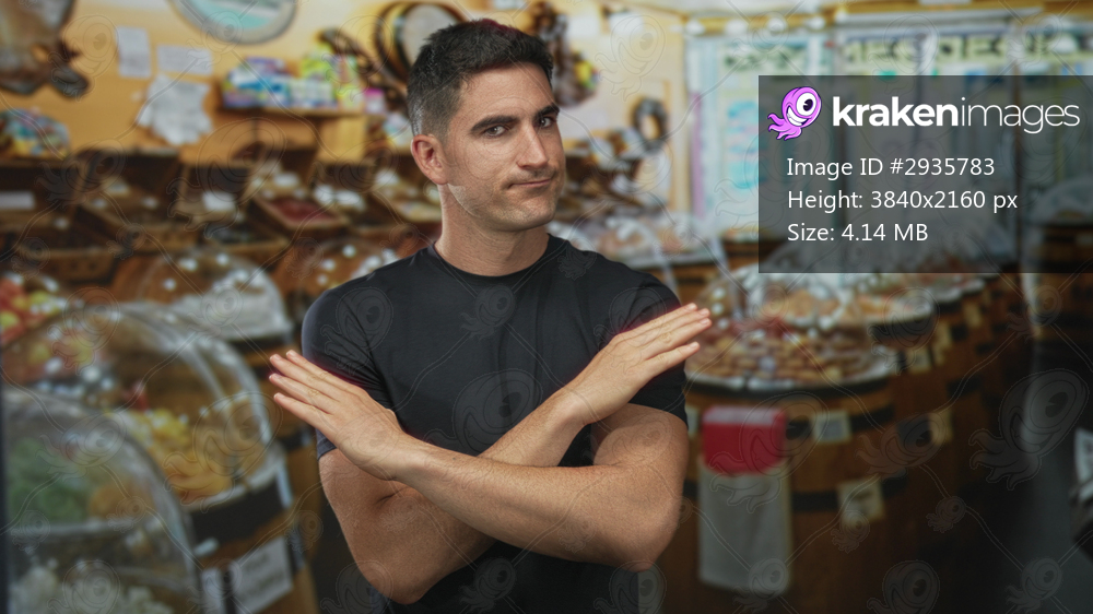 Man young hispanic standing with arms crossed x across chest near wooden candy barrels and glass jars in a candy shop inside a building; rejection.