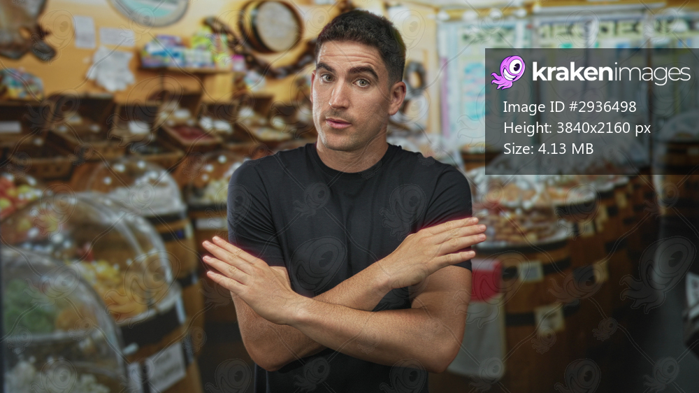 Man young hispanic standing with arms crossed x across chest near wooden candy barrels and glass jars in a candy shop inside a building; rejection.