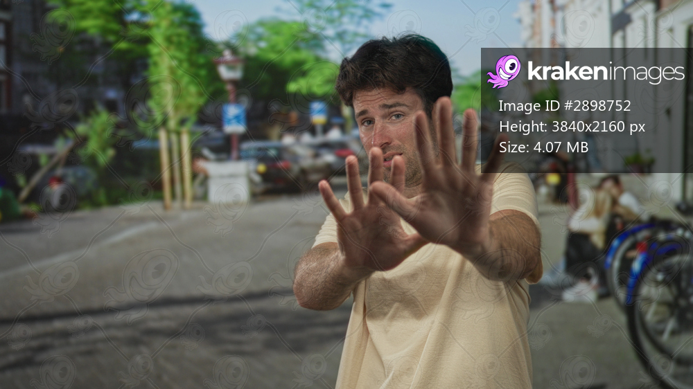 Man, young hispanic, wearing beige t shirt, hands raised palms out in a stop gesture on a busy city street beside parked bicycles and cars; hesitation. - Kraken Images