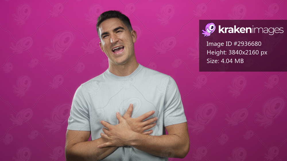 Man young hispanic wearing light blue t shirt with hands crossed on chest laughing and singing in studio with pink backdrop; joy warmth.