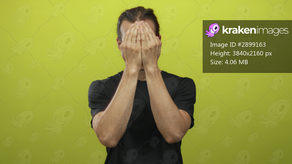 Man young with long hair wearing black tshirt raising hands and covering face in lime green studio; playful curiosity.
