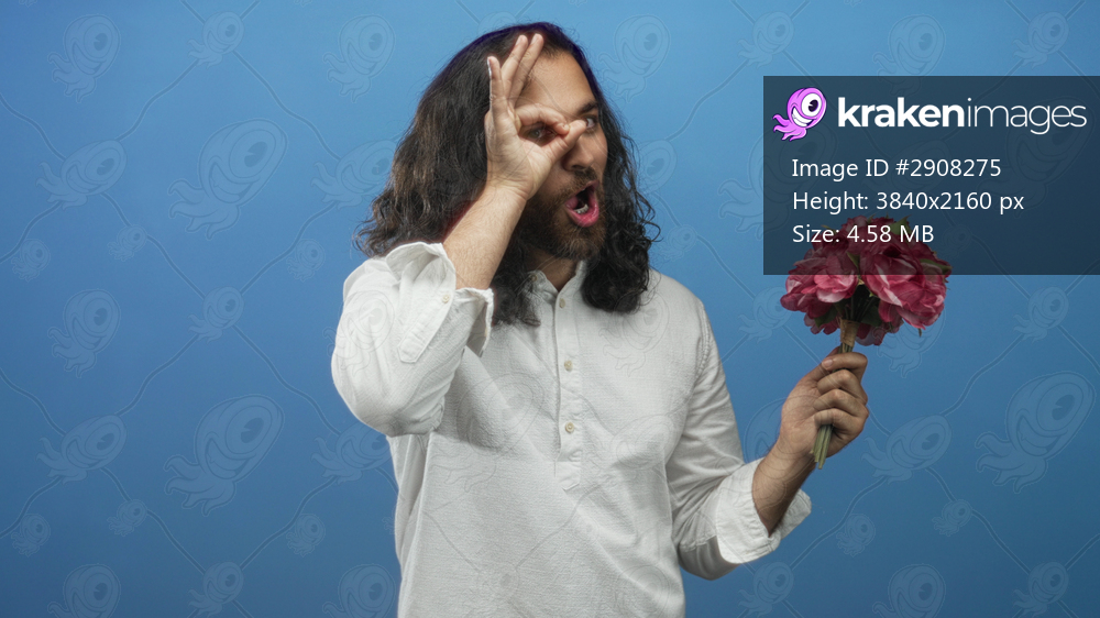 Man, young, making ok sign with hand while holding pink bouquet in blue studio; romantic playfulness.