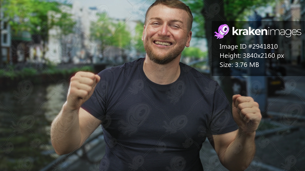 Man young overweight caucasian raising clenched fists and smiling with head tilted back on a street by a canal in amsterdam; pure joy.