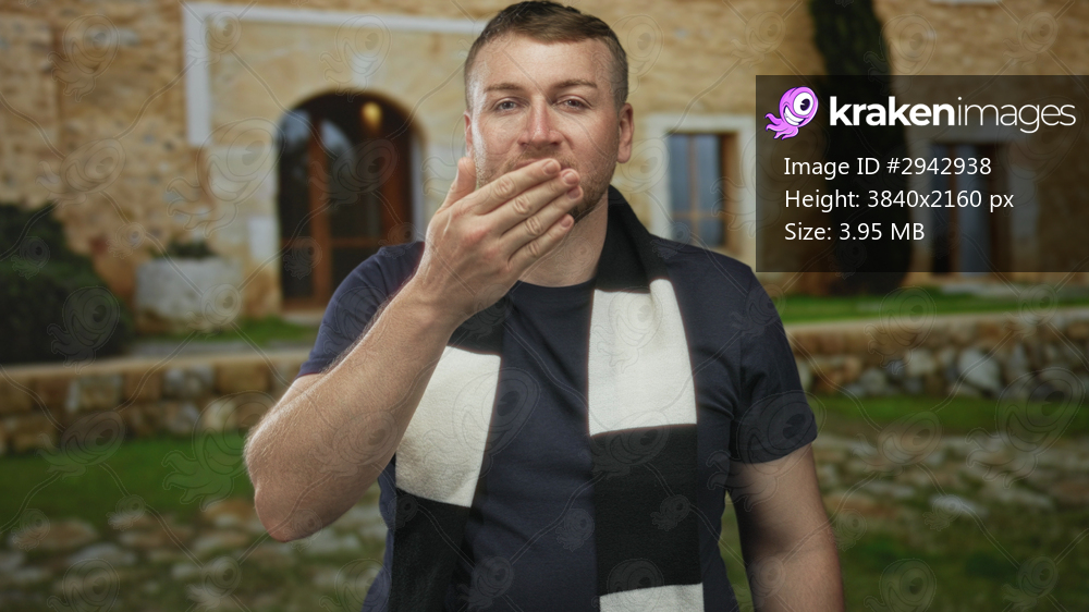 Man young and stocky wearing black and white scarf offers handshake and presses hand to mouth at building entrance outdoors; friendship welcome support. - Kraken Images